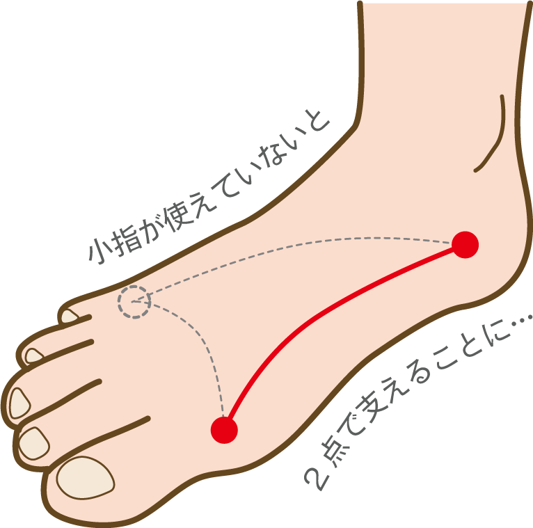小指側が使えていないと、踵と母指球の2点で足を支えることになってしまいます。 それだと左右のグラつきが大きくなり、足裏のアーチも潰れやすくなっていきます。