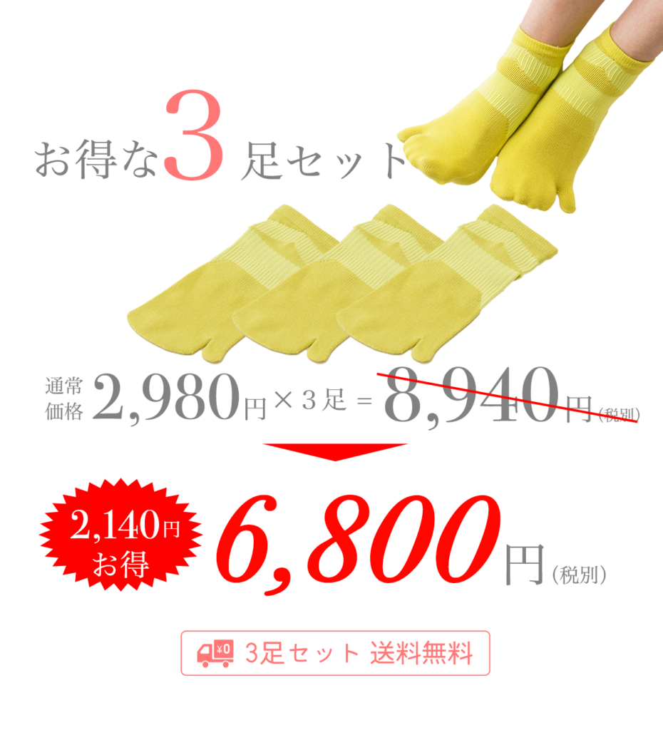 今なら3足セットで6,800円(税別)になり、通常より2,140円お得となっております。